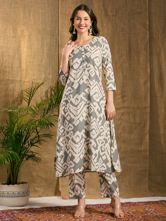 Abstract Ikat Printed A-Line Cotton Flax Co-ord...