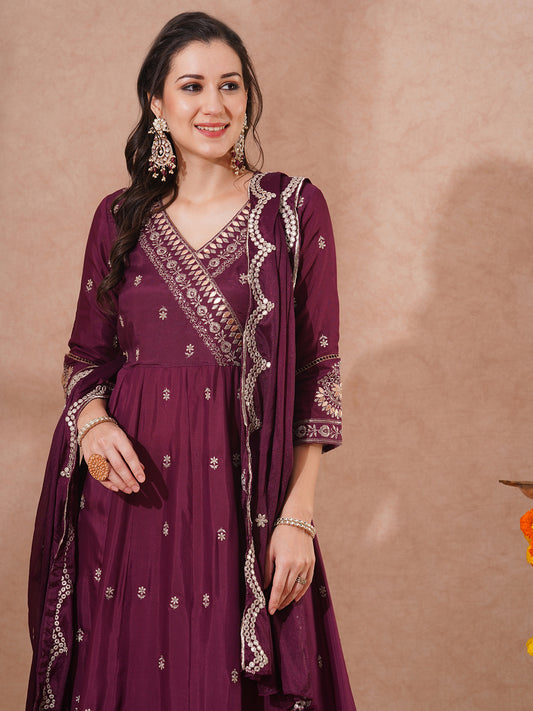 Solid Floral Embroidered Angrakha Kurta with Palazzo...