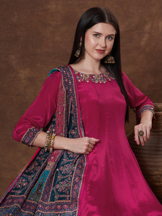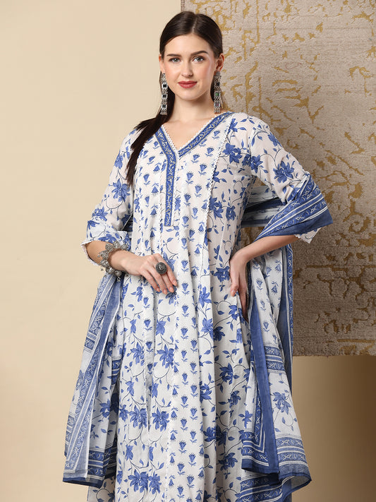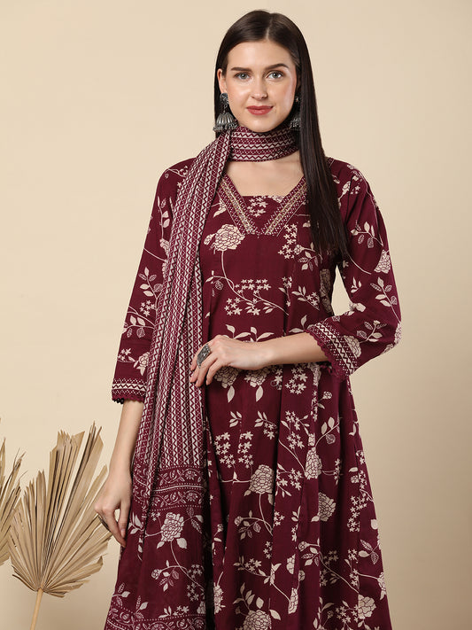 Ethnic Floral Printed & Embroidered Anarkali with...