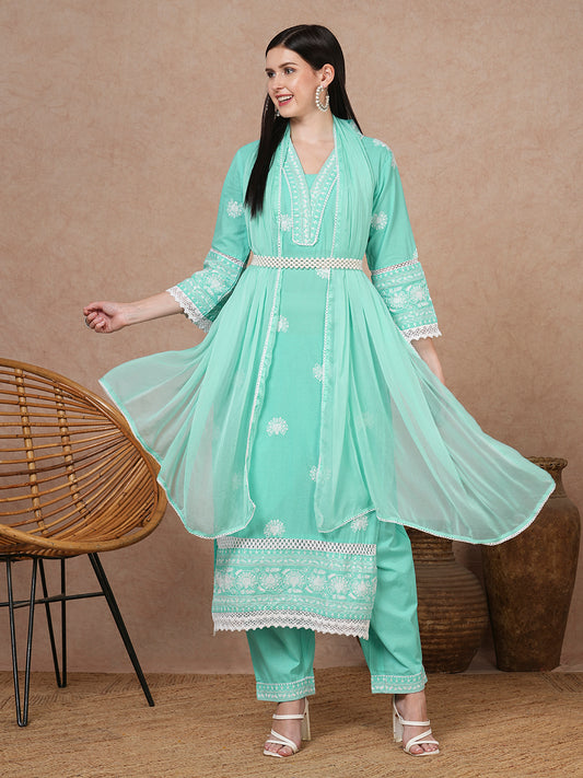Solid Ethnic Embroidered A-Line Pleated Kurta with...