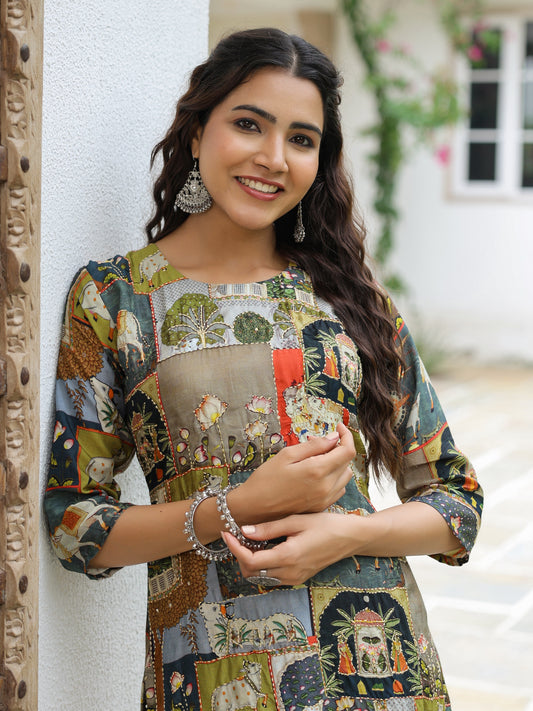 Ethnic Pichwai Printed & Kantha Sequin Embroidered...