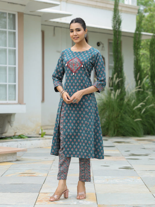 Solid Ethnic Embroidered Straight Kurta with Pant...