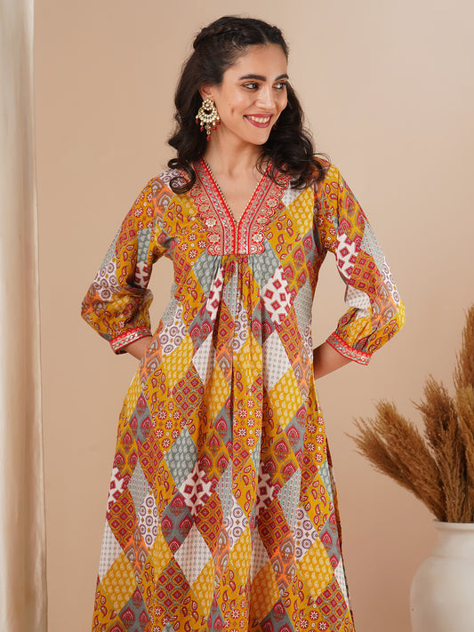 Ethnic Printed & Embroidered A-Line Pleated Co-ord...