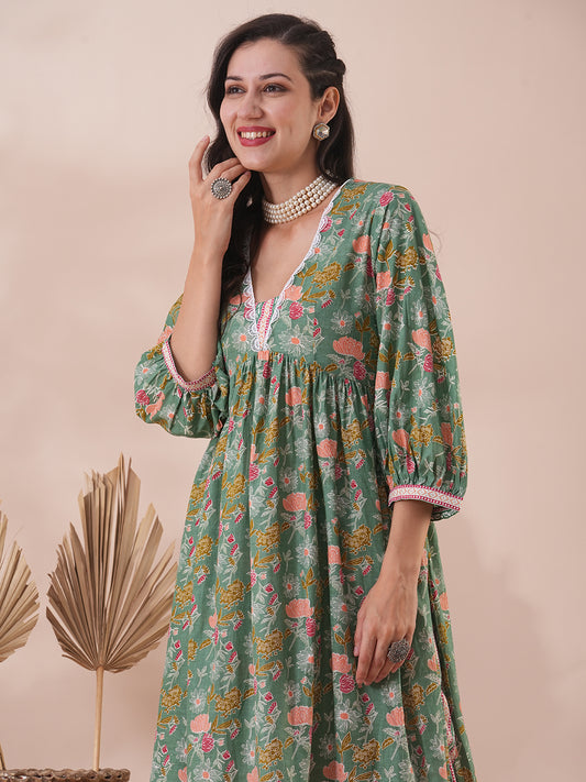 Ethnic Floral & Stripes Printed A-Line Pleated...