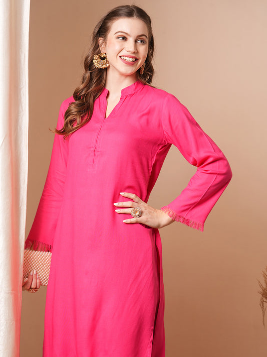 MRP (Inclusive of all taxes)Regular price ₹ 1,549.00₹ 1,549.00 Regular priceUnit price / per₹ 3,899.00Sale priceM L XL 2XL 3XL add to cartSale{"id":7442463522902,"title":"Solid Straight Fit Fringed Co-ord Set - Pink","handle":"solid-straight-fit-fringed-co-ord-set-pink","description":"\u003ch1\u003eHighlights\u003cbr\u003e\n\u003c\/h1\u003e\n\u003cp\u003e\u003cbr\u003e-Straight Fit Kurta\u003cbr\u003e-Fringe Detailing at Sleeve Hem \u0026amp; Kurta\u003cbr\u003e-Mandarin Collar\u003c\/p\u003e\n\u003ch1\u003eFabric \u0026amp; Colour\u003c\/h1\u003e\n\u003cp\u003e\u003cbr\u003eTop Colour: Pink\u003cbr\u003eTop Fabric: Viscose Rayon\u003cbr\u003eBottom Colour: Pink\u003cbr\u003eBottom Fabric: Viscose Rayon\u003c\/p\u003e\n\u003ch1\u003eSpecifications\u003c\/h1\u003e\n\u003cp\u003e\u003cbr\u003eTop Design: Solid\u003cbr\u003eTop Craft: Plain and Prints\u003cbr\u003eTop Shape: Straight\u003cbr\u003eNeck: Mandarin Collar\u003cbr\u003eSleeve Length: Three-Quarter Sleeves\u003cbr\u003eTop Length: Knee Length\u003cbr\u003eHemline: Straight\u003cbr\u003eSlit: Side Slits\u003c\/p\u003e\n\u003cp\u003eBottom Type: Palazzos\u003cbr\u003eBottom Closure: Slip-On\u003cbr\u003eWaistband: Elasticated\u003c\/p\u003e\n\u003cp\u003eWash Care: Hand Wash\u003c\/p\u003e\n\u003cp\u003eLength (in inches)\u003cbr\u003eKurta – 41, Sleeves – 20,\u003cbr\u003eBottom - 38\u003c\/p\u003e\n\u003cp\u003eModel’s Height: 5’7”. Wearing Size S.\u003c\/p\u003e\n\u003ch1\u003eProduct Information\u003c\/h1\u003e\n\u003cp\u003e\u003cbr\u003eManufactured\/Packed\/Marketed By:\u003cbr\u003eFashor Lifestyle Pvt. Ltd.\u003cbr\u003e28\/30, Sudarshanpura Industrial Area,\u003cbr\u003eJaipur - 302006.\u003cbr\u003eCountry of Origin: India\u003c\/p\u003e","published_at":"2025-06-09T19:41:25+05:30","created_at":"2024-11-11T08:33:45+05:30","vendor":"FASHOR","type":"2P Kurta Set","tags":["1001-2000","25145","2XL","3XL","All Styles","bogo-zone","casualwear","co-ord","colour_pink","craft_plain-and-prints","design_solid","fabric_rayon","fabric_viscose-rayon","flash","KURTI","kurtis","L","M","meta-size-chart-","now-trending","shape_straight","under-1000","workwear"],"price":154900,"price_min":154900,"price_max":154900,"available":true,"price_varies":false,"compare_at_price":389900,"compare_at_price_min":389900,"compare_at_price_max":389900,"compare_at_price_varies":false,"variants":[{"id":41909921972310,"title":"M","option1":"M","option2":null,"option3":null,"sku":"38-KBA25145G4FS","requires_shipping":true,"taxable":false,"featured_image":{"id":33643220729942,"product_id":7442463522902,"position":4,"created_at":"2024-11-11T08:34:13+05:30","updated_at":"2025-06-09T19:41:25+05:30","alt":null,"width":1080,"height":1440,"src":"\/\/fashor.com\/cdn\/shop\/files\/28387_8.jpg?v=1749478285","variant_ids":[41909921972310,41909922005078,41909922037846,41909922070614,41909922103382]},"available":true,"name":"Solid Straight Fit Fringed Co-ord Set - Pink - M","public_title":"M","options":["M"],"price":154900,"weight":0,"compare_at_price":389900,"inventory_quantity":1,"inventory_management":"shopify","inventory_policy":"deny","barcode":null,"featured_media":{"alt":null,"id":26183460323414,"position":4,"preview_image":{"aspect_ratio":0.75,"height":1440,"width":1080,"src":"\/\/fashor.com\/cdn\/shop\/files\/28387_8.jpg?v=1749478285"}},"requires_selling_plan":false,"selling_plan_allocations":[],"quantity_rule":{"min":1,"max":null,"increment":1}},{"id":41909922005078,"title":"L","option1":"L","option2":null,"option3":null,"sku":"40-KBA25145G4FS","requires_shipping":true,"taxable":false,"featured_image":{"id":33643220729942,"product_id":7442463522902,"position":4,"created_at":"2024-11-11T08:34:13+05:30","updated_at":"2025-06-09T19:41:25+05:30","alt":null,"width":1080,"height":1440,"src":"\/\/fashor.com\/cdn\/shop\/files\/28387_8.jpg?v=1749478285","variant_ids":[41909921972310,41909922005078,41909922037846,41909922070614,41909922103382]},"available":true,"name":"Solid Straight Fit Fringed Co-ord Set - Pink - L","public_title":"L","options":["L"],"price":154900,"weight":0,"compare_at_price":389900,"inventory_quantity":5,"inventory_management":"shopify","inventory_policy":"deny","barcode":null,"featured_media":{"alt":null,"id":26183460323414,"position":4,"preview_image":{"aspect_ratio":0.75,"height":1440,"width":1080,"src":"\/\/fashor.com\/cdn\/shop\/files\/28387_8.jpg?v=1749478285"}},"requires_selling_plan":false,"selling_plan_allocations":[],"quantity_rule":{"min":1,"max":null,"increment":1}},{"id":41909922037846,"title":"XL","option1":"XL","option2":null,"option3":null,"sku":"42-KBA25145G4FS","requires_shipping":true,"taxable":false,"featured_image":{"id":33643220729942,"product_id":7442463522902,"position":4,"created_at":"2024-11-11T08:34:13+05:30","updated_at":"2025-06-09T19:41:25+05:30","alt":null,"width":1080,"height":1440,"src":"\/\/fashor.com\/cdn\/shop\/files\/28387_8.jpg?v=1749478285","variant_ids":[41909921972310,41909922005078,41909922037846,41909922070614,41909922103382]},"available":false,"name":"Solid Straight Fit Fringed Co-ord Set - Pink - XL","public_title":"XL","options":["XL"],"price":154900,"weight":0,"compare_at_price":389900,"inventory_quantity":0,"inventory_management":"shopify","inventory_policy":"deny","barcode":null,"featured_media":{"alt":null,"id":26183460323414,"position":4,"preview_image":{"aspect_ratio":0.75,"height":1440,"width":1080,"src":"\/\/fashor.com\/cdn\/shop\/files\/28387_8.jpg?v=1749478285"}},"requires_selling_plan":false,"selling_plan_allocations":[],"quantity_rule":{"min":1,"max":null,"increment":1}},{"id":41909922070614,"title":"2XL","option1":"2XL","option2":null,"option3":null,"sku":"44-KBA25145G4FS","requires_shipping":true,"taxable":false,"featured_image":{"id":33643220729942,"product_id":7442463522902,"position":4,"created_at":"2024-11-11T08:34:13+05:30","updated_at":"2025-06-09T19:41:25+05:30","alt":null,"width":1080,"height":1440,"src":"\/\/fashor.com\/cdn\/shop\/files\/28387_8.jpg?v=1749478285","var