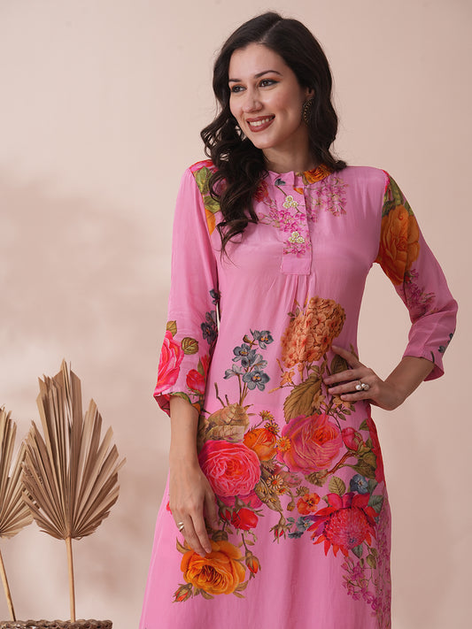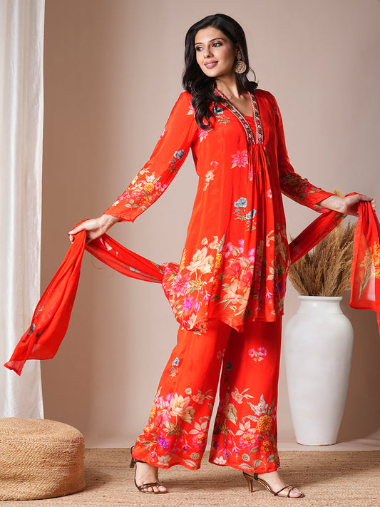 Abstract Floral Printed A-Line Pleated Kurta with...