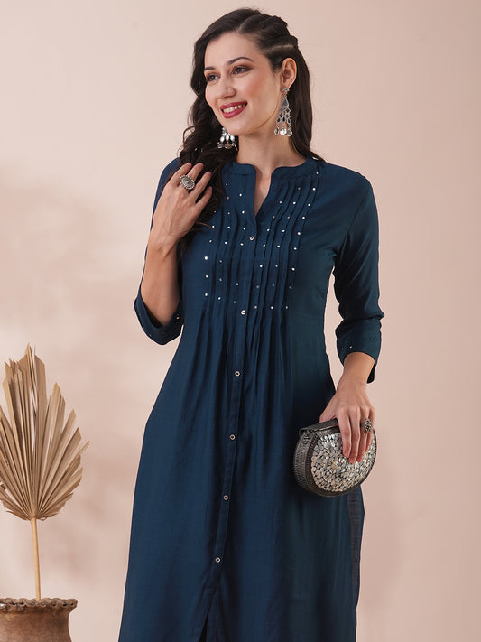 Solid Pin Tucked & Mirror Embroidered A-Line...