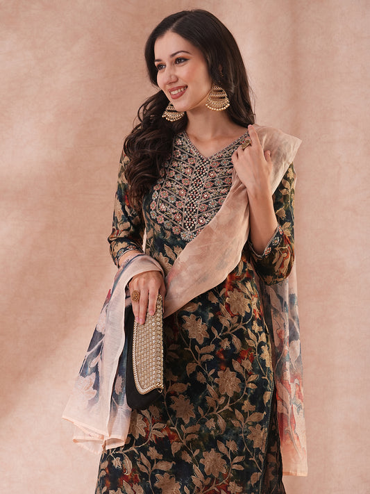 Abstract Floral Printed & Embroidered A-Line Paneled...