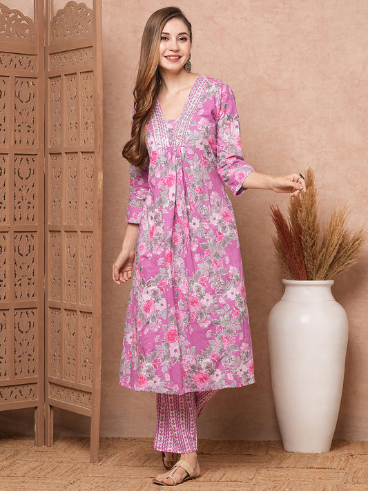 Ethnic Printed & Embroidered A-Line Pleated Short...