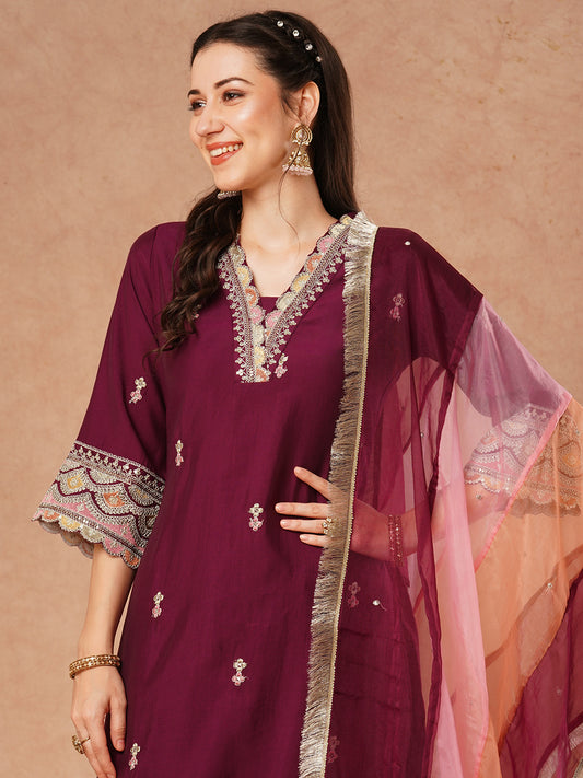 Solid Ethnic Embroidered Straight Kurta with Pant...