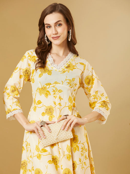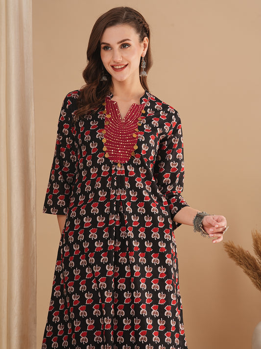 Ethnic Floral Printed Embroidered A-Line Kurta -...