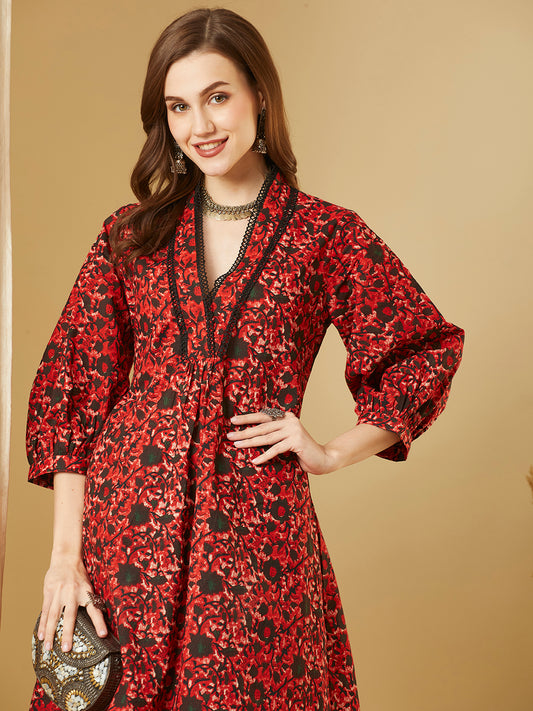 Ethnic Floral Printed & Embroidered A-Line Paneled...