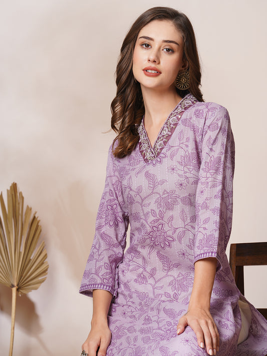 Ethnic Floral Printed & Embroidered Straight Fit...