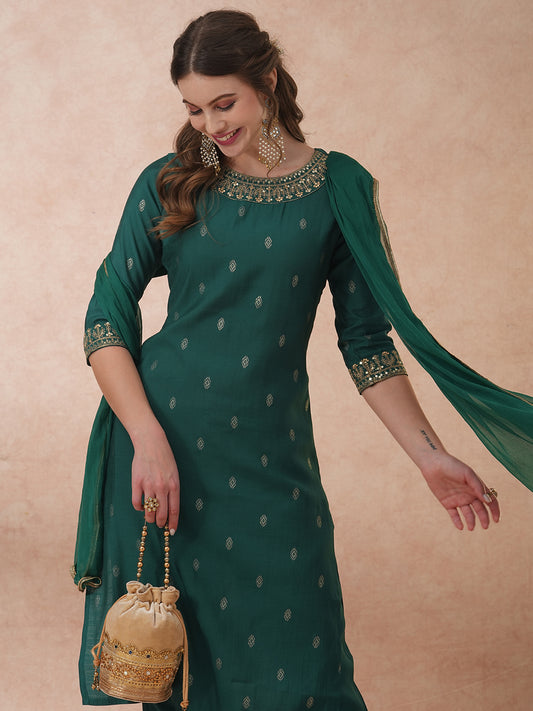 Ethnic Floral Printed & Embroidered Straight Fit...