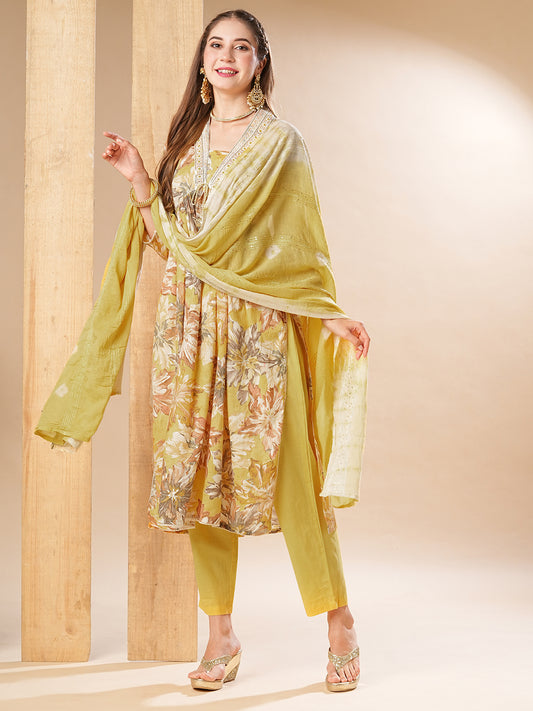 Abstract Floral Printed & Embroidered A-Line Pleated...