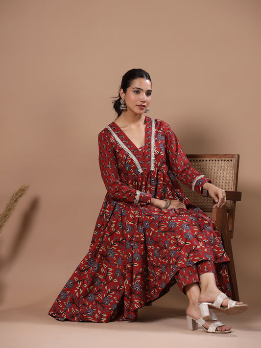 MRP (Inclusive of all taxes)Regular price ₹ 2,149.00₹ 2,149.00 Regular priceUnit price / per₹ 5,199.00Sale priceS M L XL 2XL add to cartSale{"id":7318326444118,"title":"Floral Printed \u0026 Embroidered A-Line Paneled Kurta with Pant \u0026 Dupatta -Red","handle":"floral-printed-embroidered-a-line-paneled-kurta-with-pant-dupatta-red-1","description":"\u003ch1\u003eHighlights\u003c\/h1\u003e\n\u003cp\u003e\u003cbr\u003e-A-Line Paneled Kurta \u003cbr\u003e-Floral Prints all over\u003cbr\u003e-Comes with Floral Printed Pure Cotton Dupatta\u003c\/p\u003e\n\u003ch1\u003eFabric \u0026amp; Colour\u003c\/h1\u003e\n\u003cp\u003e\u003cbr\u003eTop Colour: Red\u003cbr\u003eTop Fabric: Cotton\u003cbr\u003eBottom Colour: Red\u003cbr\u003eBottom Fabric: Cotton Blend\u003cbr\u003eDupatta Colour: Red\u003cbr\u003eDupatta Fabric: Pure Cotton\u003c\/p\u003e\n\u003ch1\u003eSpecifications\u003c\/h1\u003e\n\u003cp\u003e\u003cbr\u003eTop Design: Floral print, Ethnic print\u003cbr\u003eTop Craft: Mirror work, Plain and Prints\u003cbr\u003eTop Shape: A-line\u003cbr\u003eNeck: Shawl Collar\u003cbr\u003eSleeve Length: Three-Quarter Sleeves\u003cbr\u003eTop Length: Calf Length\u003cbr\u003eHemline: Flared\u003cbr\u003eSlit: NA\u003c\/p\u003e\n\u003cp\u003eBottom Type: Trousers\u003cbr\u003eBottom Closure: Slip-On\u003cbr\u003eWaistband: Elasticated\u003c\/p\u003e\n\u003cp\u003eDupatta Pattern: Printed\u003cbr\u003eDupatta Border: Solid\u003c\/p\u003e\n\u003cp\u003eWash Care: Hand Wash\u003c\/p\u003e\n\u003cp\u003eMeasurement (in inches)\u003cbr\u003eLength – 48, Sleeves – 16,\u003cbr\u003eBottom – 38\u003c\/p\u003e\n\u003cp\u003eModel’s Height: 5’7”. Wearing Size S.\u003c\/p\u003e\n\u003ch1\u003eProduct Information\u003c\/h1\u003e\n\u003cp\u003e\u003cbr\u003eManufactured\/Packed\/Marketed By:\u003cbr\u003eFashor Lifestyle Pvt. Ltd.\u003cbr\u003e28\/30, Sudarshanpura Industrial Area,\u003cbr\u003eJaipur - 302006.\u003cbr\u003eCountry of Origin: India\u003c\/p\u003e\n\u003c!----\u003e","published_at":"2025-09-25T10:41:38+05:30","created_at":"2024-06-25T08:11:17+05:30","vendor":"FASHOR","type":"3P Kurta Set","tags":["2001-3000","23628","All Styles","bogo-zone","casualwear","colour_red","craft_mirror-work","craft_plain-and-prints","design_ethnic-print","design_floral-print","fabric_cotton","KURTI","kurtis","meta-size-chart-","S","shape_a-line","ssss","workwear"],"price":214900,"price_min":214900,"price_max":214900,"available":true,"price_varies":false,"compare_at_price":519900,"compare_at_price_min":519900,"compare_at_price_max":519900,"compare_at_price_varies":false,"variants":[{"id":43436107661398,"title":"S","option1":"S","option2":null,"option3":null,"sku":"36-STC23628E4FS","requires_shipping":true,"taxable":false,"featured_image":{"id":32859450376278,"product_id":7318326444118,"position":3,"created_at":"2024-06-25T08:11:51+05:30","updated_at":"2024-06-25T08:13:30+05:30","alt":null,"width":1080,"height":1440,"src":"\/\/fashor.com\/cdn\/shop\/files\/26403_14.jpg?v=1719283410","variant_ids":[41523019972694,41523020005462,41523020038230,41523020070998,43436107661398]},"available":true,"name":"Floral Printed \u0026 Embroidered A-Line Paneled Kurta with Pant \u0026 Dupatta -Red - S","public_title":"S","options":["S"],"price":214900,"weight":0,"compare_at_price":519900,"inventory_quantity":1,"inventory_management":"shopify","inventory_policy":"deny","barcode":"","featured_media":{"alt":null,"id":25622759407702,"position":3,"preview_image":{"aspect_ratio":0.75,"height":1440,"width":1080,"src":"\/\/fashor.com\/cdn\/shop\/files\/26403_14.jpg?v=1719283410"}},"requires_selling_plan":false,"selling_plan_allocations":[],"quantity_rule":{"min":1,"max":null,"increment":1}},{"id":41523019972694,"title":"M","option1":"M","option2":null,"option3":null,"sku":"38-STC23628E4FS","requires_shipping":true,"taxable":false,"featured_image":{"id":32859450376278,"product_id":7318326444118,"position":3,"created_at":"2024-06-25T08:11:51+05:30","updated_at":"2024-06-25T08:13:30+05:30","alt":null,"width":1080,"height":1440,"src":"\/\/fashor.com\/cdn\/shop\/files\/26403_14.jpg?v=1719283410","variant_ids":[41523019972694,41523020005462,41523020038230,41523020070998,43436107661398]},"available":false,"name":"Floral Printed \u0026 Embroidered A-Line Paneled Kurta with Pant \u0026 Dupatta -Red - M","public_title":"M","options":["M"],"price":214900,"weight":0,"compare_at_price":519900,"inventory_quantity":0,"inventory_management":"shopify","inventory_policy":"deny","barcode":"","featured_media":{"alt":null,"id":25622759407702,"position":3,"preview_image":{"aspect_ratio":0.75,"height":1440,"width":1080,"src":"\/\/fashor.com\/cdn\/shop\/files\/26403_14.jpg?v=1719283410"}},"requires_selling_plan":false,"selling_plan_allocations":[],"quantity_rule":{"min":1,"max":null,"increment":1}},{"id":41523020005462,"title":"L","option1":"L","option2":null,"option3":null,"sku":"40-STC23628E4FS","requires_shipping":true,"taxable":false,"featured_image":{"id":32859450376278,"product_id":7318326444118,"position":3,"created_at":"2024-06-25T08:11:51+05:30","updated_at":"2024-06-25T08:13:30+05:30","alt":null,"width":1080,"height":1440,"src":"\/\/fashor.com\/cdn\/shop\/files\/26403_14.jpg?v=1719283410","variant_ids":[41523019972694,41523020005462,41523020038230,41523020070998,43436107661398]},"available":false,"name":"Floral Printed \u0026 Embroidered A-Line Paneled Kurta with Pant \u0026 Dupatta -Red - L","public_title":"L","options":["L"],"price":214900,"weight":0,"compare_at_price":519900,"inventory_quantity":0,"inventory_management":"shopify","inventory_policy":"deny","barcode":"","featured_media":{"alt":null,"id":25622759407702,"position":3,"preview_image":{"aspect_ratio":0.75,"height":1440,"width":1080,"src":"\/\/fashor.com\/cdn\/shop\/files\/26403_14.jpg?v=1719283410"}},"requires_selling_plan":false,"selling_plan_allocations":[],"quantity_rule":{"min":1,"max":null,"increment":1}},{"id":41523020038230,"title":"XL","option1":"XL","option2":null,"option