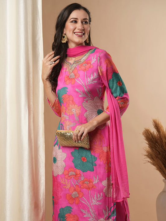Floral Printed & Hand Embroidered Straight Kurta...