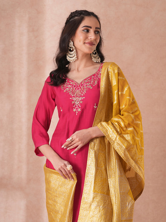 MRP (Inclusive of all taxes)Regular price ₹ 2,949.00₹ 2,949.00 Regular priceUnit price / per₹ 7,399.00Sale priceM L XL 2XL add to cartSale{"id":7429042995286,"title":"Solid Floral Hand Embroidered Straight Fit Kurta with Pant and Woven Dupatta - Ruby Pink","handle":"solid-floral-hand-embroidered-straight-fit-kurta-with-pant-and-woven-dupatta-ruby-pink","description":"\u003ch1\u003eHighlights\u003cbr\u003e\n\u003c\/h1\u003e\n\u003cp\u003e\u003cbr\u003e-Straight Fit Kurta\u003cbr\u003e-Floral Hand Embroidered yoke\u003cbr\u003e-Comed with Contrast Woven Dupatta \u003c\/p\u003e\n\u003ch1\u003eFabric \u0026amp; Colour\u003c\/h1\u003e\n\u003cp\u003e\u003cbr\u003eTop Colour: Pink\u003cbr\u003eTop Fabric: Silk Blend\u003cbr\u003eBottom Colour: Pink\u003cbr\u003eBottom Fabric: Silk Blend\u003cbr\u003eDupatta Colour: Pink\u003cbr\u003eDupatta Fabric: Poly Chanderi\u003c\/p\u003e\n\u003ch1\u003eSpecifications\u003c\/h1\u003e\n\u003cp\u003e\u003cbr\u003eTop Design: Solid\u003cbr\u003eTop Craft: Embroidery, Plain and Prints\u003cbr\u003eTop Shape: Straight\u003cbr\u003eNeck: U-Neck\u003cbr\u003eSleeve Length: Three-Quarter Sleeves\u003cbr\u003eTop Length: Calf Length\u003cbr\u003eHemline: Straight\u003cbr\u003eSlit: Side Slits\u003c\/p\u003e\n\u003cp\u003eBottom Type: Trousers\u003cbr\u003eBottom Closure: Slip-On\u003cbr\u003eWaistband: Partially Elasticated\u003c\/p\u003e\n\u003cp\u003eDupatta Pattern: Self Design\u003cbr\u003eDupatta Border: Solid\u003c\/p\u003e\n\u003cp\u003eWash Care: Dry Clean\u003c\/p\u003e\n\u003cp\u003eMeasurement (in inches)\u003cbr\u003eLength – 45, Sleeves – 17,\u003cbr\u003eBottom – 40\u003c\/p\u003e\n\u003cp\u003eModel’s Height: 5’7”. Wearing Size S.\u003c\/p\u003e\n\u003ch1\u003eProduct Information\u003c\/h1\u003e\n\u003cp\u003e\u003cbr\u003eManufactured\/Packed\/Marketed By:\u003cbr\u003eFashor Lifestyle Pvt. Ltd.\u003cbr\u003e28\/30, Sudarshanpura Industrial Area,\u003cbr\u003eJaipur - 302006.\u003cbr\u003eCountry of Origin: India\u003c\/p\u003e","published_at":"2025-10-01T06:21:33+05:30","created_at":"2024-10-22T13:55:27+05:30","vendor":"FASHOR","type":"3P Kurta Set","tags":["1001-2000","2001-3000","25475","2XL","All Styles","bogo-zone","colour_pink","craft_embroidery","craft_plain-and-prints","design_solid","fabric_silk-blend","flash","KURTI","kurtis","M","meta-size-chart-","occasionwear","shape_straight"],"price":294900,"price_min":294900,"price_max":294900,"available":true,"price_varies":false,"compare_at_price":739900,"compare_at_price_min":739900,"compare_at_price_max":739900,"compare_at_price_varies":false,"variants":[{"id":41834771021910,"title":"M","option1":"M","option2":null,"option3":null,"sku":"38-STB25475H4FS","requires_shipping":true,"taxable":false,"featured_image":{"id":33520572268630,"product_id":7429042995286,"position":3,"created_at":"2024-10-22T13:55:45+05:30","updated_at":"2025-06-09T19:49:27+05:30","alt":null,"width":1080,"height":1440,"src":"\/\/fashor.com\/cdn\/shop\/files\/27619_8.jpg?v=1749478767","variant_ids":[41834771021910,41834771054678,41834771087446,41834771120214]},"available":true,"name":"Solid Floral Hand Embroidered Straight Fit Kurta with Pant and Woven Dupatta - Ruby Pink - M","public_title":"M","options":["M"],"price":294900,"weight":0,"compare_at_price":739900,"inventory_quantity":1,"inventory_management":"shopify","inventory_policy":"deny","barcode":null,"featured_media":{"alt":null,"id":26106022690902,"position":3,"preview_image":{"aspect_ratio":0.75,"height":1440,"width":1080,"src":"\/\/fashor.com\/cdn\/shop\/files\/27619_8.jpg?v=1749478767"}},"requires_selling_plan":false,"selling_plan_allocations":[],"quantity_rule":{"min":1,"max":null,"increment":1}},{"id":41834771054678,"title":"L","option1":"L","option2":null,"option3":null,"sku":"40-STB25475H4FS","requires_shipping":true,"taxable":false,"featured_image":{"id":33520572268630,"product_id":7429042995286,"position":3,"created_at":"2024-10-22T13:55:45+05:30","updated_at":"2025-06-09T19:49:27+05:30","alt":null,"width":1080,"height":1440,"src":"\/\/fashor.com\/cdn\/shop\/files\/27619_8.jpg?v=1749478767","variant_ids":[41834771021910,41834771054678,41834771087446,41834771120214]},"available":false,"name":"Solid Floral Hand Embroidered Straight Fit Kurta with Pant and Woven Dupatta - Ruby Pink - L","public_title":"L","options":["L"],"price":294900,"weight":0,"compare_at_price":739900,"inventory_quantity":0,"inventory_management":"shopify","inventory_policy":"deny","barcode":null,"featured_media":{"alt":null,"id":26106022690902,"position":3,"preview_image":{"aspect_ratio":0.75,"height":1440,"width":1080,"src":"\/\/fashor.com\/cdn\/shop\/files\/27619_8.jpg?v=1749478767"}},"requires_selling_plan":false,"selling_plan_allocations":[],"quantity_rule":{"min":1,"max":null,"increment":1}},{"id":41834771087446,"title":"XL","option1":"XL","option2":null,"option3":null,"sku":"42-STB25475H4FS","requires_shipping":true,"taxable":false,"featured_image":{"id":33520572268630,"product_id":7429042995286,"position":3,"created_at":"2024-10-22T13:55:45+05:30","updated_at":"2025-06-09T19:49:27+05:30","alt":null,"width":1080,"height":1440,"src":"\/\/fashor.com\/cdn\/shop\/files\/27619_8.jpg?v=1749478767","variant_ids":[41834771021910,41834771054678,41834771087446,41834771120214]},"available":false,"name":"Solid Floral Hand Embroidered Straight Fit Kurta with Pant and Woven Dupatta - Ruby Pink - XL","public_title":"XL","options":["XL"],"price":294900,"weight":0,"compare_at_price":739900,"inventory_quantity":0,"inventory_management":"shopify","inventory_policy":"deny","barcode":null,"featured_media":{"alt":null,"id":26106022690902,"position":3,"preview_image":{"aspect_ratio":0.75,"height":1440,"width":1080,"src":"\/\/fashor.com\/cdn\/shop\/files\/27619_8.jpg?v=1749478767"}},"requires_selling_plan":false,"selling_plan_allocations":[],"quantity_rule":{"min":1,"max":null,"increment":1}},{"id":41834771120214,"title":"2XL","option1":"2XL","option2":null,"option3":null,"sku":"44-STB25475H4