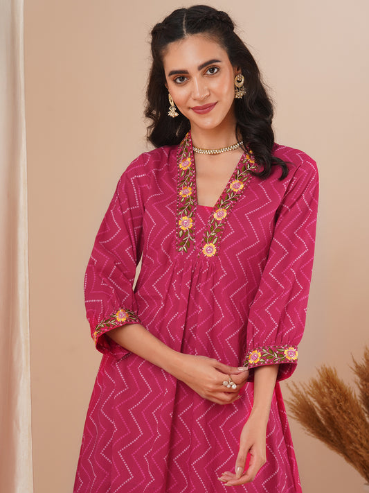 Ethnic Chevron Printed & Embroidered A-Line Kurta...