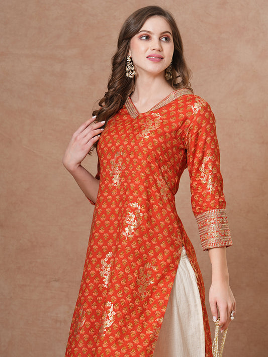 Ethnic Floral Foil Printed & Embroidered Straight...