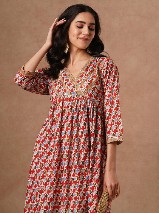Ethnic Printed & Embroidered A-Line Pleated Short...