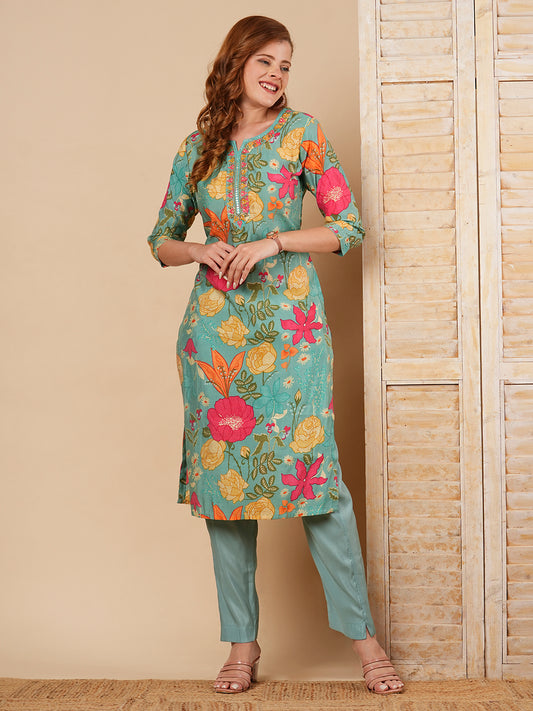 Floral Printed & Chikankari Embroidered Straight Fit...