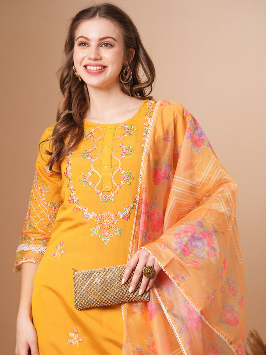 Ethnic Floral Printed & Embroidered A-Line Kurta...