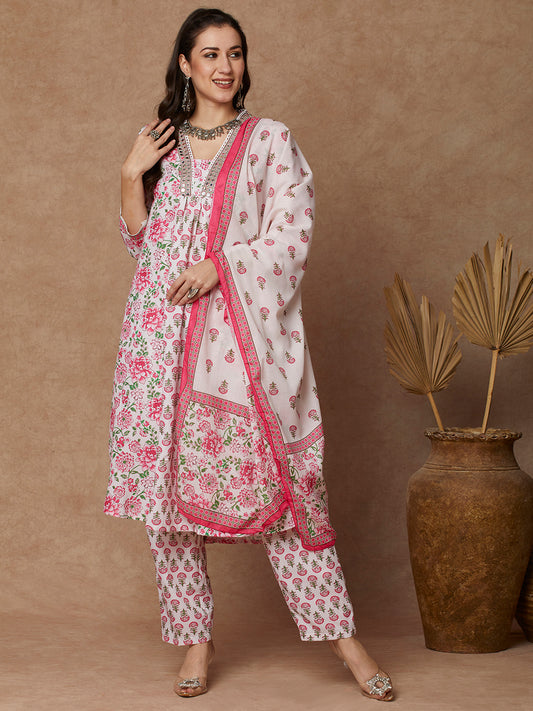 Ethnic Floral Printed & Embroidered Anarkali Kurta...