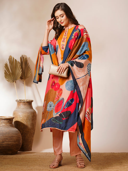 Abstract Floral Printed & Kantha Embroidered Straight...