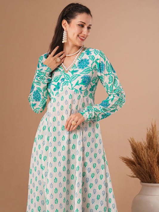 Ethnic Lotus Printed & Embroidered A-Line Kurta...