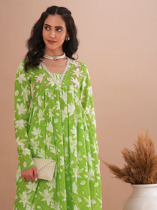 Abstract Floral Printed & Embroidered A-Line Pleated...