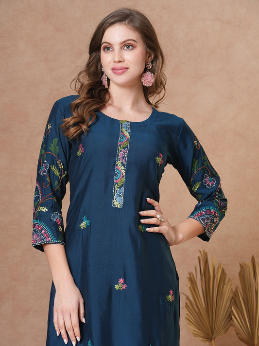 Solid Ethnic Embroidered Straight Fit Kurta with...