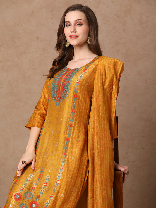Ethnic Floral Foil Printed & Embroidered Straight...