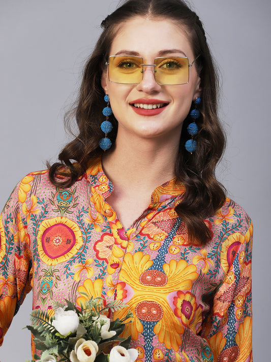 Abstract Floral Printed A-Line Flared Kurta with...