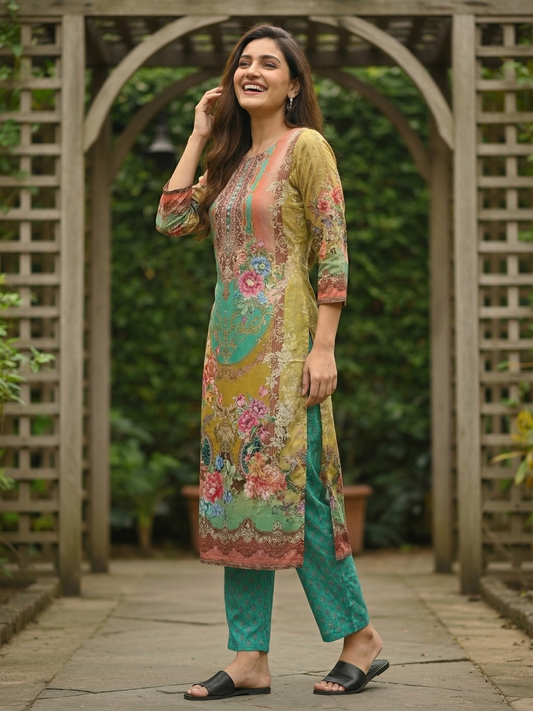 Ethnic Floral Printed & Embroidered Straight Fit...