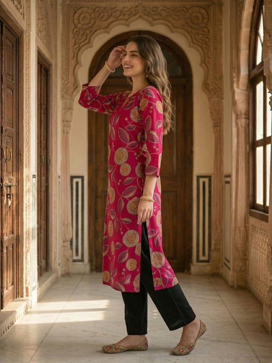 MRP (Inclusive of all taxes)Regular price ₹ 799.00₹ 799.00 Regular priceUnit price / per₹ 1,599.00Sale priceM L XL 2XL add to cartSale{"id":7847080493142,"title":"Floral \u0026 Ornamental Printed Straight Kurta - Multi","handle":"floral-ornamental-printed-straight-kurta-multi","description":"\u003ch1\u003e\u003cstrong\u003eHighlights\u003c\/strong\u003e\u003c\/h1\u003e\n\u003cp\u003eVibrant and eye-catching, this printed straight-fit kurta is a perfect blend of traditional artistry and contemporary elegance. Designed in a rich fusion of pink and teal hues, the kurta features intricate floral and ornamental prints that create a statement look for any occasion.\u003c\/p\u003e\n\u003cp\u003eThe neckline is beautifully detailed with decorative panel-inspired prints and subtle embellishment accents, adding depth and richness to the overall design. Three-quarter sleeves with coordinated border detailing enhance the ethnic appeal while maintaining a refined silhouette.\u003c\/p\u003e\n\u003cp\u003eCrafted in a lightweight and breathable fabric, this kurta ensures all-day comfort while offering a polished and graceful look. Ideal for festive gatherings, casual celebrations, or elevated daywear, it pairs effortlessly with trousers, palazzos, or churidars for versatile styling.\u003c\/p\u003e\n\n\u003ch1\u003e\u003cstrong\u003eFabric \u0026amp; Colour\u003c\/strong\u003e\u003c\/h1\u003e\n\u003cul\u003e\n\u003cli\u003eColour: Pink \u0026amp; Teal\u003c\/li\u003e\n\u003cli\u003eFabric: Cotton Blend\u003c\/li\u003e\n\u003c\/ul\u003e\n\n\u003ch1\u003e\u003cstrong\u003eSpecifications\u003c\/strong\u003e\u003c\/h1\u003e\n\u003cul\u003e\n\u003cli\u003eDesign: Floral \u0026amp; Ornamental Print\u003c\/li\u003e\n\u003cli\u003eCraft: Printed Detailing\u003c\/li\u003e\n\u003cli\u003eShape: Straight\u003c\/li\u003e\n\u003cli\u003eNeck: Round Neck\u003c\/li\u003e\n\u003cli\u003eSleeve Length: Three-Quarter Sleeves\u003c\/li\u003e\n\u003cli\u003eTop Length: Calf Length\u003c\/li\u003e\n\u003cli\u003eHemline: Straight\u003c\/li\u003e\n\u003cli\u003eSlit: Side Slits\u003c\/li\u003e\n\u003c\/ul\u003e\n\n\u003cp\u003e\u003cstrong\u003eWash Care:\u003c\/strong\u003e Hand Wash Separately in Cold Water\u003c\/p\u003e\n\n\u003ch1\u003e\u003cstrong\u003eLength (in inches)\u003c\/strong\u003e\u003c\/h1\u003e\n\u003cp\u003eKurta – 46, Sleeves – 17\u003c\/p\u003e\n\n\u003cp\u003eModel's Height: 5'7\". Wearing Size S.\u003c\/p\u003e\n\n\u003ch1\u003e\u003cstrong\u003eProduct Information\u003c\/strong\u003e\u003c\/h1\u003e\n\u003cp\u003eManufactured\/Packed\/Marketed By:\u003cbr\u003eFashor Lifestyle Pvt. Ltd.\u003cbr\u003e28\/30, Sudarshanpura Industrial Area,\u003cbr\u003eJaipur - 302006.\u003cbr\u003eCountry of Origin: India\u003c\/p\u003e","published_at":"2026-04-14T19:35:45+05:30","created_at":"2026-04-14T19:32:05+05:30","vendor":"FASHOR","type":"Kurta","tags":["2XL","casualwear","colour_multi","craft_printed","design_floral-print","fabric_cotton-blend","Festive Wear","Kurta","L","M","shape_straight","under-1000","workwear","XL"],"price":79900,"price_min":79900,"price_max":79900,"available":true,"price_varies":false,"compare_at_price":159900,"compare_at_price_min":159900,"compare_at_price_max":159900,"compare_at_price_varies":false,"variants":[{"id":44500020822102,"title":"M","option1":"M","option2":null,"option3":null,"sku":"38-KA032720I5OS","requires_shipping":true,"taxable":true,"featured_image":{"id":36661243248726,"product_id":7847080493142,"position":1,"created_at":"2026-04-14T19:27:19+05:30","updated_at":"2026-04-14T19:27:21+05:30","alt":null,"width":1080,"height":1440,"src":"\/\/fashor.com\/cdn\/shop\/files\/front_8b05eb35-c585-4bcd-8001-89fb08ed3c68.png?v=1776175041","variant_ids":[44500020822102,44500020854870,44500020887638,44500020920406]},"available":true,"name":"Floral \u0026 Ornamental Printed Straight Kurta - Multi - M","public_title":"M","options":["M"],"price":79900,"weight":0,"compare_at_price":159900,"inventory_quantity":10,"inventory_management":"shopify","inventory_policy":"deny","barcode":"","featured_media":{"alt":null,"id":28669747789910,"position":1,"preview_image":{"aspect_ratio":0.75,"height":1440,"width":1080,"src":"\/\/fashor.com\/cdn\/shop\/files\/front_8b05eb35-c585-4bcd-8001-89fb08ed3c68.png?v=1776175041"}},"requires_selling_plan":false,"selling_plan_allocations":[],"quantity_rule":{"min":1,"max":null,"increment":1}},{"id":44500020854870,"title":"L","option1":"L","option2":null,"option3":null,"sku":"40-KA032720I5OS","requires_shipping":true,"taxable":true,"featured_image":{"id":36661243248726,"product_id":7847080493142,"position":1,"created_at":"2026-04-14T19:27:19+05:30","updated_at":"2026-04-14T19:27:21+05:30","alt":null,"width":1080,"height":1440,"src":"\/\/fashor.com\/cdn\/shop\/files\/front_8b05eb35-c585-4bcd-8001-89fb08ed3c68.png?v=1776175041","variant_ids":[44500020822102,44500020854870,44500020887638,44500020920406]},"available":true,"name":"Floral \u0026 Ornamental Printed Straight Kurta - Multi - L","public_title":"L","options":["L"],"price":79900,"weight":0,"compare_at_price":159900,"inventory_quantity":13,"inventory_management":"shopify","inventory_policy":"deny","barcode":"","featured_media":{"alt":null,"id":28669747789910,"position":1,"preview_image":{"aspect_ratio":0.75,"height":1440,"width":1080,"src":"\/\/fashor.com\/cdn\/shop\/files\/front_8b05eb35-c585-4bcd-8001-89fb08ed3c68.png?v=1776175041"}},"requires_selling_plan":false,"selling_plan_allocations":[],"quantity_rule":{"min":1,"max":null,"increment":1}},{"id":44500020887638,"title":"XL","option1":"XL","option2":null,"option3":null,"sku":"42-KA032720I5OS","requires_shipping":true,"taxable":true,"featured_image":{"id":36661243248726,"product_id":7847080493142,"position":1,"created_at":"2026-04-14T19:27:19+05:30","updated_at":"2026-04-14T19:27:21+05:30","alt":null,"width":1080,"height":1440,"src":"\/\/fashor.com\/cdn\/shop\/files\/front_8b05eb35-c585-4bcd-8001-89fb08ed3c68.png?v=1776175041","variant_ids":[44500