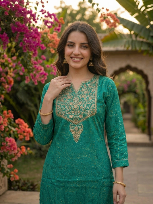 MRP (Inclusive of all taxes)Regular price ₹ 899.00₹ 899.00 Regular priceUnit price / per₹ 1,899.00Sale priceM L XL 2XL add to cartSale{"id":7844580098134,"title":"Floral Printed \u0026 Embroidered Straight Kurta - Rama Green","handle":"floral-printed-embroidered-straight-kurta-rama-green","description":"\u003ch1\u003e\u003cstrong\u003eHighlights\u003c\/strong\u003e\u003c\/h1\u003e\n\u003cp\u003eStep into effortless elegance with this Rama Green ethnic floral printed straight fit kurta, crafted from soft, flowy muslin silk for all-day ease. The graceful straight silhouette flatters every body type while offering a polished, contemporary look. A delicate round neckline adds a touch of understated charm, perfect for everyday wear or special gatherings. The highlight of the piece is its exquisite sequin and threadwork embroidery, bringing in the richness of traditional craftsmanship. Ethnic floral prints blend modern artistry with cultural elegance, creating a refined yet vibrant aesthetic. Style it with minimal accessories and straight pants for a chic, timeless ensemble.\u003c\/p\u003e\n\n\u003ch1\u003e\u003cstrong\u003eFabric \u0026amp; Colour\u003c\/strong\u003e\u003c\/h1\u003e\n\u003cul\u003e\n\u003cli\u003eColour: Rama Green\u003c\/li\u003e\n\u003cli\u003eFabric: Muslin Silk\u003c\/li\u003e\n\u003c\/ul\u003e\n\n\u003ch1\u003e\u003cstrong\u003eSpecifications\u003c\/strong\u003e\u003c\/h1\u003e\n\u003cul\u003e\n\u003cli\u003eDesign: Floral print, Ethnic print, Solid\u003c\/li\u003e\n\u003cli\u003eCraft: Threadwork, Zari\u003c\/li\u003e\n\u003cli\u003eShape: Straight\u003c\/li\u003e\n\u003cli\u003eNeck: Round Neckline\u003c\/li\u003e\n\u003cli\u003eSleeve Length: Three-Quarter Sleeves\u003c\/li\u003e\n\u003cli\u003eTop Length: Knee Length\u003c\/li\u003e\n\u003cli\u003eHemline: Straight\u003c\/li\u003e\n\u003cli\u003eSlit: Side Slits\u003c\/li\u003e\n\u003c\/ul\u003e\n\n\u003cp\u003e\u003cstrong\u003eWash Care:\u003c\/strong\u003e Machine Wash\u003c\/p\u003e\n\n\u003ch1\u003e\u003cstrong\u003eLength (in inches)\u003c\/strong\u003e\u003c\/h1\u003e\n\u003cp\u003eKurta – 46, Sleeves – 17\u003c\/p\u003e\n\n\u003cp\u003eModel's Height: 5'7\". Wearing Size S.\u003c\/p\u003e\n\n\u003ch1\u003e\u003cstrong\u003eProduct Information\u003c\/strong\u003e\u003c\/h1\u003e\n\u003cp\u003eManufactured\/Packed\/Marketed By:\u003cbr\u003eFashor Lifestyle Pvt. Ltd.\u003cbr\u003e28\/30, Sudarshanpura Industrial Area,\u003cbr\u003eJaipur - 302006.\u003cbr\u003eCountry of Origin: India\u003c\/p\u003e","published_at":"2026-04-11T12:29:47+05:30","created_at":"2026-04-11T12:15:36+05:30","vendor":"FASHOR","type":"Kurta","tags":["2XL","Below 1000","casualwear","colour_green","craft_threadwork","design_floral-print","Embroidered","Everyday Wear","fabric_muslin-silk","Kurta","L","M","shape_straight","Under ₹1000 Store","under-1000","workwear","XL"],"price":89900,"price_min":89900,"price_max":89900,"available":true,"price_varies":false,"compare_at_price":189900,"compare_at_price_min":189900,"compare_at_price_max":189900,"compare_at_price_varies":false,"variants":[{"id":44432713220182,"title":"M","option1":"M","option2":null,"option3":null,"sku":"38-KA032737I5OS","requires_shipping":true,"taxable":true,"featured_image":{"id":36643258630230,"product_id":7844580098134,"position":1,"created_at":"2026-04-11T12:09:05+05:30","updated_at":"2026-04-11T12:09:07+05:30","alt":null,"width":1080,"height":1440,"src":"\/\/fashor.com\/cdn\/shop\/files\/33398_1.jpg?v=1775889547","variant_ids":[44432713220182,44432713252950,44432713285718,44432713318486]},"available":true,"name":"Floral Printed \u0026 Embroidered Straight Kurta - Rama Green - M","public_title":"M","options":["M"],"price":89900,"weight":0,"compare_at_price":189900,"inventory_quantity":9,"inventory_management":"shopify","inventory_policy":"deny","barcode":"","featured_media":{"alt":null,"id":28652294307926,"position":1,"preview_image":{"aspect_ratio":0.75,"height":1440,"width":1080,"src":"\/\/fashor.com\/cdn\/shop\/files\/33398_1.jpg?v=1775889547"}},"requires_selling_plan":false,"selling_plan_allocations":[],"quantity_rule":{"min":1,"max":null,"increment":1}},{"id":44432713252950,"title":"L","option1":"L","option2":null,"option3":null,"sku":"40-KA032737I5OS","requires_shipping":true,"taxable":true,"featured_image":{"id":36643258630230,"product_id":7844580098134,"position":1,"created_at":"2026-04-11T12:09:05+05:30","updated_at":"2026-04-11T12:09:07+05:30","alt":null,"width":1080,"height":1440,"src":"\/\/fashor.com\/cdn\/shop\/files\/33398_1.jpg?v=1775889547","variant_ids":[44432713220182,44432713252950,44432713285718,44432713318486]},"available":true,"name":"Floral Printed \u0026 Embroidered Straight Kurta - Rama Green - L","public_title":"L","options":["L"],"price":89900,"weight":0,"compare_at_price":189900,"inventory_quantity":11,"inventory_management":"shopify","inventory_policy":"deny","barcode":"","featured_media":{"alt":null,"id":28652294307926,"position":1,"preview_image":{"aspect_ratio":0.75,"height":1440,"width":1080,"src":"\/\/fashor.com\/cdn\/shop\/files\/33398_1.jpg?v=1775889547"}},"requires_selling_plan":false,"selling_plan_allocations":[],"quantity_rule":{"min":1,"max":null,"increment":1}},{"id":44432713285718,"title":"XL","option1":"XL","option2":null,"option3":null,"sku":"42-KA032737I5OS","requires_shipping":true,"taxable":true,"featured_image":{"id":36643258630230,"product_id":7844580098134,"position":1,"created_at":"2026-04-11T12:09:05+05:30","updated_at":"2026-04-11T12:09:07+05:30","alt":null,"width":1080,"height":1440,"src":"\/\/fashor.com\/cdn\/shop\/files\/33398_1.jpg?v=1775889547","variant_ids":[44432713220182,44432713252950,44432713285718,44432713318486]},"available":true,"name":"Floral Printed \u0026 Embroidered Straight Kurta - Rama Green - XL","public_title":"XL","options":["XL"],"price":89900,"weight":0,"compare_at_price":189900,"inventory_quantity":7,"inventory_management":"shopify","inventory_policy":"deny","barcode":"","featured_med