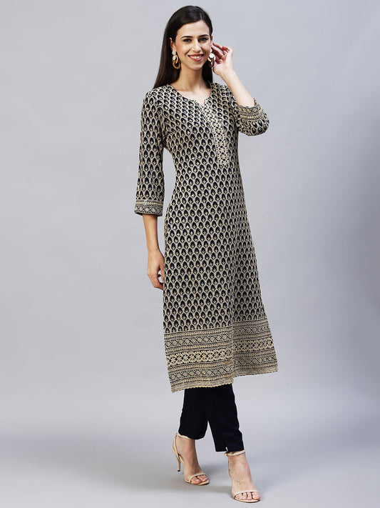 Abstract Floral Printed & Chikankari Embroidered Straight...