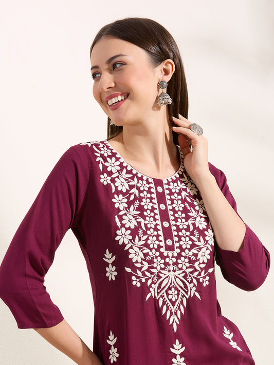 Solid Floral Chikankari Embroidered Straight Fit Kurta...