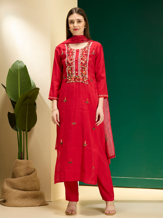 • Ethnic Floral Printed & Embroidered Straight Fit...
