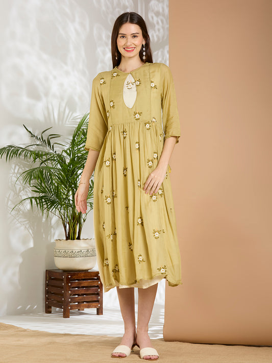 • Solid A-Line Paneled Dress with Layered Embroidered...