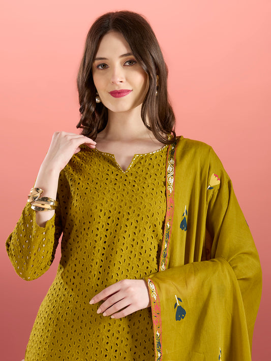 • Solid Schiffli Floral Embroidered Straight Kurta with...