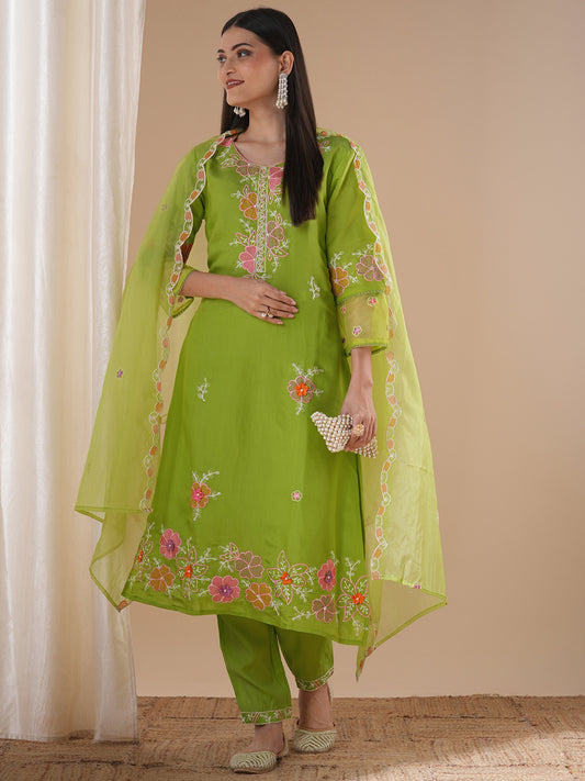 MRP (Inclusive of all taxes)Regular price ₹ 2,199.00₹ 2,199.00 Regular priceUnit price / per₹ 7,799.00Sale priceM L XL 2XL add to cartSale{"id":7695137112150,"title":"Solid Floral Embroidered Straight Fit Kurta with Pant and Dupatta - Light Green","handle":"solid-floral-embroidered-straight-fit-kurta-with-pant-and-dupatta-light-green","description":"\u003ch1\u003eHighlights\u003c\/h1\u003e\n\u003cp\u003e\u003cbr\u003e-This solid straight fit kurta with ethnic floral thread embroidery all over at front and pearl highlights with round neckline and paired with solid pant and solid embroidered organza dupatta is a great choice for light festivities.\u003c\/p\u003e\n\u003ch1\u003e\n\u003cbr\u003eFabric \u0026amp; Colour\u003c\/h1\u003e\n\u003cp\u003e\u003cbr\u003eTop Colour: Green\u003cbr\u003eTop Fabric: Muslin Silk\u003cbr\u003eBottom Colour: Green\u003cbr\u003eBottom Fabric: Shantoon\u003cbr\u003eDupatta Colour: Green\u003cbr\u003eDupatta Fabric: Organza\u003c\/p\u003e\n\u003ch1\u003eSpecifications\u003c\/h1\u003e\n\u003cp\u003e\u003cbr\u003eTop Design: Solid\u003cbr\u003eTop Craft: Embroidery, Plain and Prints\u003cbr\u003eTop Shape: Straight\u003cbr\u003eNeck: Round Neck\u003cbr\u003eSleeve Length: Three-Quarter Sleeves\u003cbr\u003eTop Length: Knee Length\u003cbr\u003eHemline: Straight\u003cbr\u003eSlit: Side Slits\u003c\/p\u003e\n\u003cp\u003eBottom Type: Trousers\u003cbr\u003eBottom Closure: Slip-On\u003cbr\u003eWaistband: Elasticated\u003c\/p\u003e\n\u003cp\u003eDupatta Pattern: Embroidered, Solid\u003cbr\u003eDupatta Border: Solid\u003c\/p\u003e\n\u003cp\u003eWash Care: Hand Wash\u003c\/p\u003e\n\u003cp\u003eLength (in inches)\u003cbr\u003eKurta – 44, Sleeves – 17,\u003cbr\u003eBottom – 40\u003c\/p\u003e\n\u003cp\u003eModel’s Height: 5’7”. Wearing Size S.\u003c\/p\u003e\n\u003ch1\u003eProduct Information\u003c\/h1\u003e\n\u003cp\u003e\u003cbr\u003eManufactured\/Packed\/Marketed By:\u003cbr\u003eFashor Lifestyle Pvt. Ltd.\u003cbr\u003e28\/30, Sudarshanpura Industrial Area,\u003cbr\u003eJaipur - 302006.\u003cbr\u003eCountry of Origin: India\u003c\/p\u003e","published_at":"2025-11-01T11:22:17+05:30","created_at":"2025-10-31T15:57:02+05:30","vendor":"FASHOR","type":"3P Kurta Set","tags":["2001-3000","28682","2XL","above-3000","All Styles","casualwear","colour_Green","craft_embroidery","craft_plain-and-prints","design_solid","discount-zone","fabric_muslin-silk","KURTI","kurtis","L","M","meta-size-chart-","now-trending","offer-zone","shape_straight","XL"],"price":219900,"price_min":219900,"price_max":219900,"available":true,"price_varies":false,"compare_at_price":779900,"compare_at_price_min":779900,"compare_at_price_max":779900,"compare_at_price_varies":false,"variants":[{"id":43564061196374,"title":"M","option1":"M","option2":null,"option3":null,"sku":"38-STB28682A5FS","requires_shipping":true,"taxable":false,"featured_image":{"id":35526904250454,"product_id":7695137112150,"position":3,"created_at":"2025-10-31T15:58:29+05:30","updated_at":"2025-10-31T15:59:12+05:30","alt":null,"width":1080,"height":1440,"src":"\/\/fashor.com\/cdn\/shop\/files\/30015_1.jpg?v=1761906552","variant_ids":[43564061196374,43564061229142,43564061261910,43564061294678]},"available":true,"name":"Solid Floral Embroidered Straight Fit Kurta with Pant and Dupatta - Light Green - M","public_title":"M","options":["M"],"price":219900,"weight":0,"compare_at_price":779900,"inventory_quantity":17,"inventory_management":"shopify","inventory_policy":"deny","barcode":"","featured_media":{"alt":null,"id":27613060464726,"position":3,"preview_image":{"aspect_ratio":0.75,"height":1440,"width":1080,"src":"\/\/fashor.com\/cdn\/shop\/files\/30015_1.jpg?v=1761906552"}},"requires_selling_plan":false,"selling_plan_allocations":[],"quantity_rule":{"min":1,"max":null,"increment":1}},{"id":43564061229142,"title":"L","option1":"L","option2":null,"option3":null,"sku":"40-STB28682A5FS","requires_shipping":true,"taxable":false,"featured_image":{"id":35526904250454,"product_id":7695137112150,"position":3,"created_at":"2025-10-31T15:58:29+05:30","updated_at":"2025-10-31T15:59:12+05:30","alt":null,"width":1080,"height":1440,"src":"\/\/fashor.com\/cdn\/shop\/files\/30015_1.jpg?v=1761906552","variant_ids":[43564061196374,43564061229142,43564061261910,43564061294678]},"available":true,"name":"Solid Floral Embroidered Straight Fit Kurta with Pant and Dupatta - Light Green - L","public_title":"L","options":["L"],"price":219900,"weight":0,"compare_at_price":779900,"inventory_quantity":11,"inventory_management":"shopify","inventory_policy":"deny","barcode":"","featured_media":{"alt":null,"id":27613060464726,"position":3,"preview_image":{"aspect_ratio":0.75,"height":1440,"width":1080,"src":"\/\/fashor.com\/cdn\/shop\/files\/30015_1.jpg?v=1761906552"}},"requires_selling_plan":false,"selling_plan_allocations":[],"quantity_rule":{"min":1,"max":null,"increment":1}},{"id":43564061261910,"title":"XL","option1":"XL","option2":null,"option3":null,"sku":"42-STB28682A5FS","requires_shipping":true,"taxable":false,"featured_image":{"id":35526904250454,"product_id":7695137112150,"position":3,"created_at":"2025-10-31T15:58:29+05:30","updated_at":"2025-10-31T15:59:12+05:30","alt":null,"width":1080,"height":1440,"src":"\/\/fashor.com\/cdn\/shop\/files\/30015_1.jpg?v=1761906552","variant_ids":[43564061196374,43564061229142,43564061261910,43564061294678]},"available":true,"name":"Solid Floral Embroidered Straight Fit Kurta with Pant and Dupatta - Light Green - XL","public_title":"XL","options":["XL"],"price":219900,"weight":0,"compare_at_price":779900,"inventory_quantity":20,"inventory_management":"shopify","inventory_policy":"deny","barcode":"","featured_media":{"alt":null,"id":27613060464726,"position":3,"preview_image":{"aspect_ratio":0.75,"height":1440,"width":1080,"src":"\/\/fashor.com\/cdn\/shop\/files\/30015_1.jpg?v=1761906552"}},"requires_selling_plan":false,"selling_plan_allocations":[],"quantity_rule":{"min":1,"max":null,"increment":1}},{"id"
