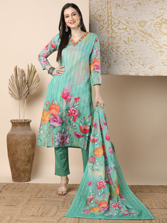 Abstract Floral Printed & Embroidered Straight Fit...