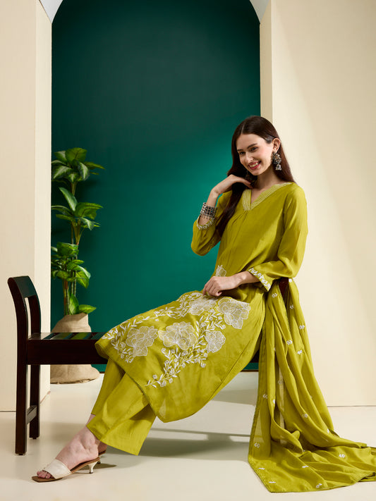 MRP (Inclusive of all taxes)Regular price ₹ 3,899.00₹ 3,899.00 Regular priceUnit price / per₹ 9,799.00Sale priceM L XL 2XL add to cartSale{"id":7695054176342,"title":"Solid Abstract Floral Embroidered A-Line Kurta with Palazzo \u0026 Dupatta - Lime Green","handle":"solid-abstract-floral-embroidered-a-line-kurta-with-palazzo-dupatta-lime-green","description":"\u003ch1\u003eHighlights\u003cbr\u003e\n\u003c\/h1\u003e\n\u003cp\u003e\u003cbr\u003e-Crafted from luxurious Chanderi fabric, it features a graceful V-neckline and intricate threadwork embroidery that adds a touch of elegance. Paired with matching palazzo pants and a complementing dupatta, this ensemble blends sophistication with vibrant charm—perfect for festive and celebratory occasions.\u003c\/p\u003e\n\u003ch1\u003e\n\u003cbr\u003eFabric \u0026amp; Colour\u003c\/h1\u003e\n\u003cp\u003e\u003cbr\u003eTop Colour: Lime Green\u003cbr\u003eTop Fabric: Poly Chanderi\u003cbr\u003eBottom Colour: Lime Green\u003cbr\u003eBottom Fabric: Chanderi\u003cbr\u003eDupatta Colour: Lime Green\u003cbr\u003eDupatta Fabric: Poly Chanderi\u003c\/p\u003e\n\u003ch1\u003eSpecifications\u003c\/h1\u003e\n\u003cp\u003e\u003cbr\u003eTop Design: Solid\u003cbr\u003eTop Craft: Embroidery, Plain and Prints\u003cbr\u003eTop Shape: A-line\u003cbr\u003eNeck: V-Neck\u003cbr\u003eSleeve Length: Three-Quarter Sleeves\u003cbr\u003eTop Length: Calf Length\u003cbr\u003eHemline: Flared\u003cbr\u003e\u003c\/p\u003e\n\u003cp\u003eBottom Type: Palazzos\u003cbr\u003eBottom Closure: Slip-On\u003cbr\u003eWaistband: Partially Elasticated\u003c\/p\u003e\n\u003cp\u003eDupatta Pattern: Embroidered, Solid\u003cbr\u003eDupatta Border: Solid\u003c\/p\u003e\n\u003cp\u003eWash Care: Machine Wash\u003c\/p\u003e\n\u003cp\u003eLength (in inches)\u003cbr\u003eKurta – 46, Sleeves – 21,\u003cbr\u003eBottom – 40\u003c\/p\u003e\n\u003cp\u003eModel’s Height: 5’7”. Wearing Size S.\u003c\/p\u003e\n\u003ch1\u003eProduct Information\u003c\/h1\u003e\n\u003cp\u003e\u003cbr\u003eManufactured\/Packed\/Marketed By:\u003cbr\u003eFashor Lifestyle Pvt. Ltd.\u003cbr\u003e28\/30, Sudarshanpura Industrial Area,\u003cbr\u003eJaipur - 302006.\u003cbr\u003eCountry of Origin: India\u003c\/p\u003e","published_at":"2025-10-31T10:45:16+05:30","created_at":"2025-10-31T08:20:27+05:30","vendor":"FASHOR","type":"3P Kurta Set","tags":["2XL","33159","above-3000","All Styles","casualwear","colour_Green","craft_embroidery","craft_plain-and-prints","design_solid","fabric_poly-chanderi","KURTI","kurtis","L","M","meta-size-chart-","now-trending","shape_a-line","XL"],"price":389900,"price_min":389900,"price_max":389900,"available":true,"price_varies":false,"compare_at_price":979900,"compare_at_price_min":979900,"compare_at_price_max":979900,"compare_at_price_varies":false,"variants":[{"id":43562880991318,"title":"M","option1":"M","option2":null,"option3":null,"sku":"38-ST033159I5FS","requires_shipping":true,"taxable":false,"featured_image":{"id":35525953388630,"product_id":7695054176342,"position":3,"created_at":"2025-10-31T08:22:51+05:30","updated_at":"2025-10-31T08:23:40+05:30","alt":null,"width":1080,"height":1440,"src":"\/\/fashor.com\/cdn\/shop\/files\/32594_1.jpg?v=1761879220","variant_ids":[43562880991318,43562881024086,43562881056854,43562881089622]},"available":true,"name":"Solid Abstract Floral Embroidered A-Line Kurta with Palazzo \u0026 Dupatta - Lime Green - M","public_title":"M","options":["M"],"price":389900,"weight":0,"compare_at_price":979900,"inventory_quantity":3,"inventory_management":"shopify","inventory_policy":"deny","barcode":"","featured_media":{"alt":null,"id":27612129362006,"position":3,"preview_image":{"aspect_ratio":0.75,"height":1440,"width":1080,"src":"\/\/fashor.com\/cdn\/shop\/files\/32594_1.jpg?v=1761879220"}},"requires_selling_plan":false,"selling_plan_allocations":[],"quantity_rule":{"min":1,"max":null,"increment":1}},{"id":43562881024086,"title":"L","option1":"L","option2":null,"option3":null,"sku":"40-ST033159I5FS","requires_shipping":true,"taxable":false,"featured_image":{"id":35525953388630,"product_id":7695054176342,"position":3,"created_at":"2025-10-31T08:22:51+05:30","updated_at":"2025-10-31T08:23:40+05:30","alt":null,"width":1080,"height":1440,"src":"\/\/fashor.com\/cdn\/shop\/files\/32594_1.jpg?v=1761879220","variant_ids":[43562880991318,43562881024086,43562881056854,43562881089622]},"available":true,"name":"Solid Abstract Floral Embroidered A-Line Kurta with Palazzo \u0026 Dupatta - Lime Green - L","public_title":"L","options":["L"],"price":389900,"weight":0,"compare_at_price":979900,"inventory_quantity":5,"inventory_management":"shopify","inventory_policy":"deny","barcode":"","featured_media":{"alt":null,"id":27612129362006,"position":3,"preview_image":{"aspect_ratio":0.75,"height":1440,"width":1080,"src":"\/\/fashor.com\/cdn\/shop\/files\/32594_1.jpg?v=1761879220"}},"requires_selling_plan":false,"selling_plan_allocations":[],"quantity_rule":{"min":1,"max":null,"increment":1}},{"id":43562881056854,"title":"XL","option1":"XL","option2":null,"option3":null,"sku":"42-ST033159I5FS","requires_shipping":true,"taxable":false,"featured_image":{"id":35525953388630,"product_id":7695054176342,"position":3,"created_at":"2025-10-31T08:22:51+05:30","updated_at":"2025-10-31T08:23:40+05:30","alt":null,"width":1080,"height":1440,"src":"\/\/fashor.com\/cdn\/shop\/files\/32594_1.jpg?v=1761879220","variant_ids":[43562880991318,43562881024086,43562881056854,43562881089622]},"available":true,"name":"Solid Abstract Floral Embroidered A-Line Kurta with Palazzo \u0026 Dupatta - Lime Green - XL","public_title":"XL","options":["XL"],"price":389900,"weight":0,"compare_at_price":979900,"inventory_quantity":3,"inventory_management":"shopify","inventory_policy":"deny","barcode":"","featured_media":{"alt":null,"id":27612129362006,"position":3,"preview_image":{"aspect_ratio":0.75,"height":1440,"width":1080,"src":"\/\/fashor.com\/cdn\/shop\/files\/32594_1.jpg?v=1761879220"}},"requires_selling_plan"