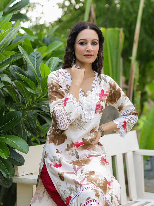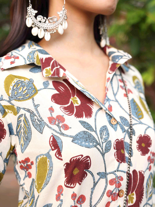 Floral Printed Wooden Buttoned Asymmetric Hem Kurta...