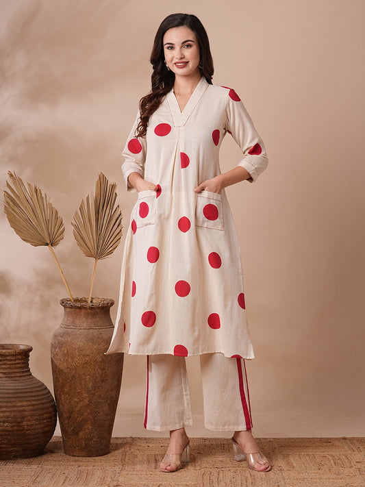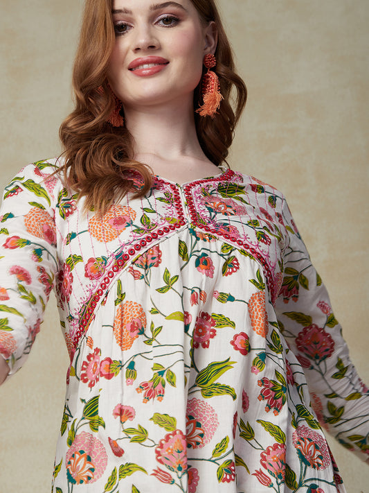 Floral Printed Wooden Buttoned Pin-Tucks Kurta with...
