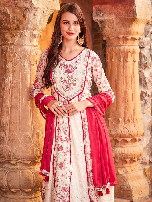 Ethnic Floral Foil Printed & Embroidered A-Line...