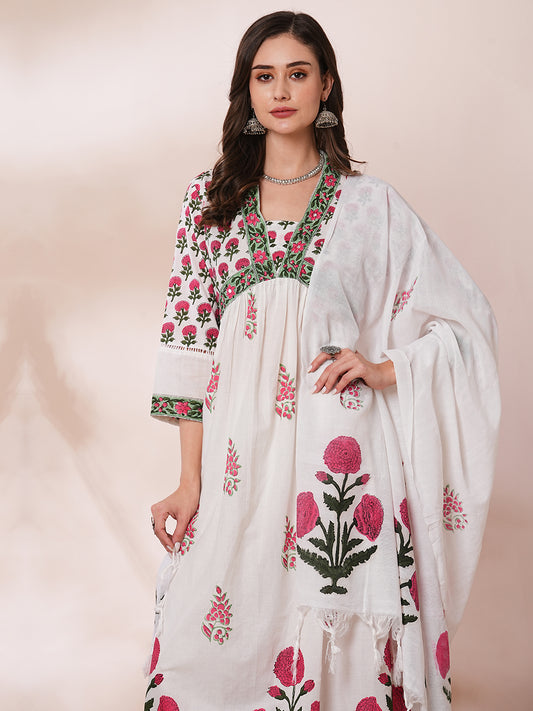 Ethnic Floral Block Printed A-Line Pleated Kurta...