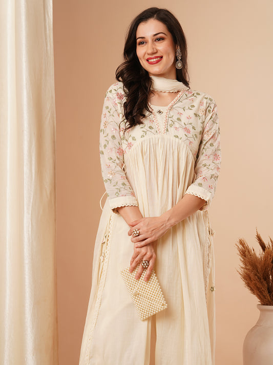 Floral Zari Embroidered A-Line Pleated Kurta with...
